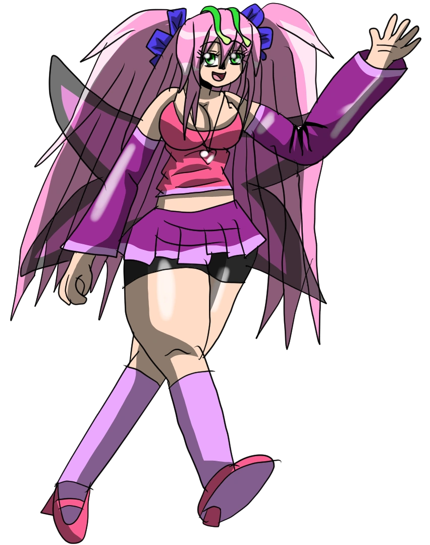 Alexis has midnight blue hair (sometimes in twin tails), tan skin, pink eyes, and usually wears a lavender shirt, an ice blue jacket, black pants, and hot pink shoes.